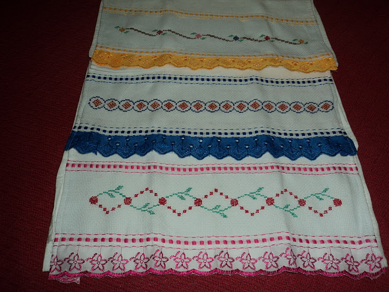 Mais alguns em ponto cruz e acabamento em viés e bordado inglês branco na beirada :